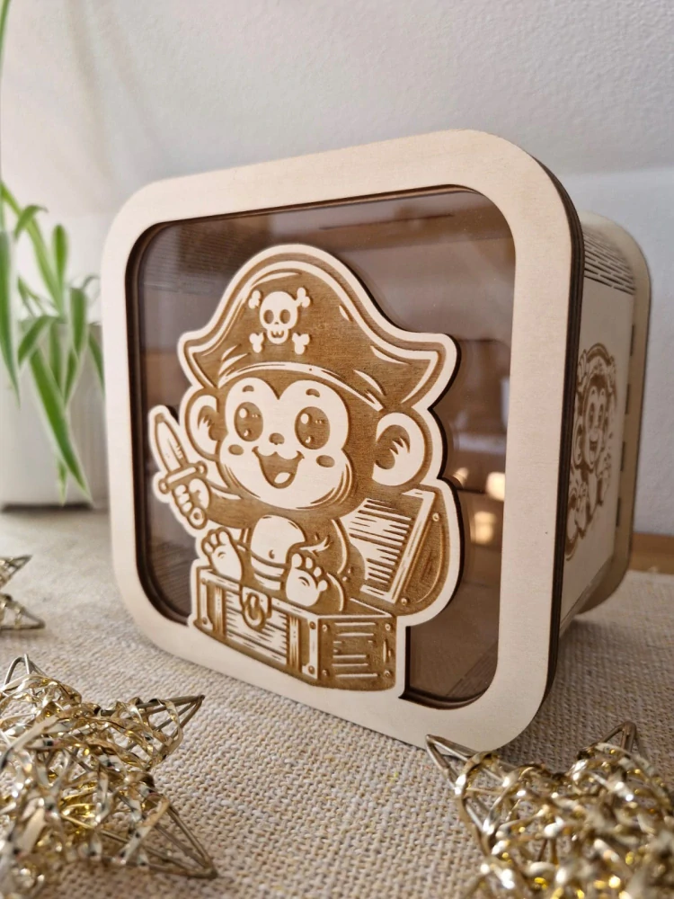 Dřevěná pokladnička z překližky s motivem je krásným a praktickým doplňkem, který může sloužit nejen jako úložiště pro vaše úspory, ale také jako dekorativní prvek vašeho interiéru.