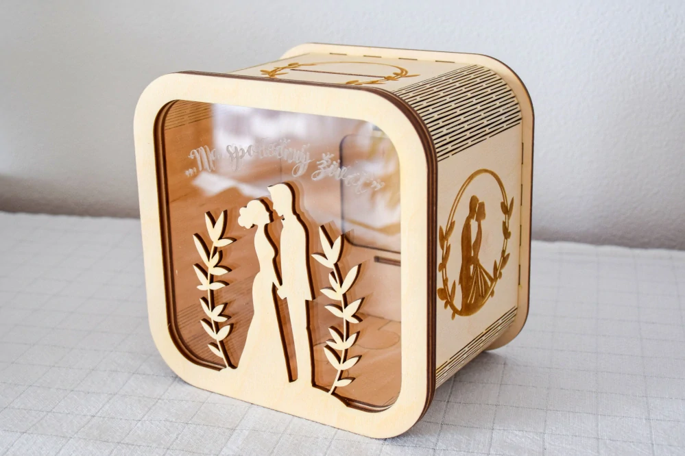 Dřevěná pokladnička z překližky s motivem je krásným a praktickým doplňkem, který může sloužit nejen jako úložiště pro vaše úspory, ale také jako dekorativní prvek vašeho interiéru.