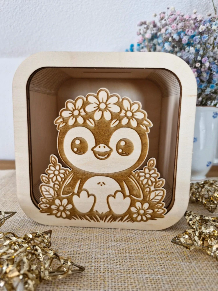 Dřevěná pokladnička z překližky s motivem je krásným a praktickým doplňkem, který může sloužit nejen jako úložiště pro vaše úspory, ale také jako dekorativní prvek vašeho interiéru.