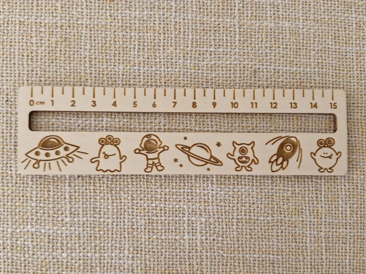 Dřevěné pravítko pro děti. Lze využít i při čtení nebo jako záložku. Výřez se používá při čtení, kdy se dětem zakryjí ostatní řádky a dítě se tak lépe soustředí na text, který čte.